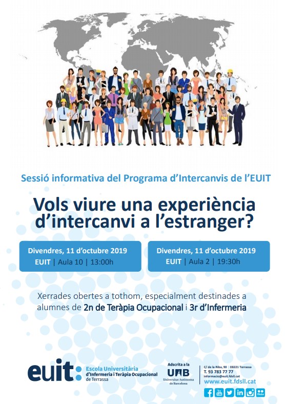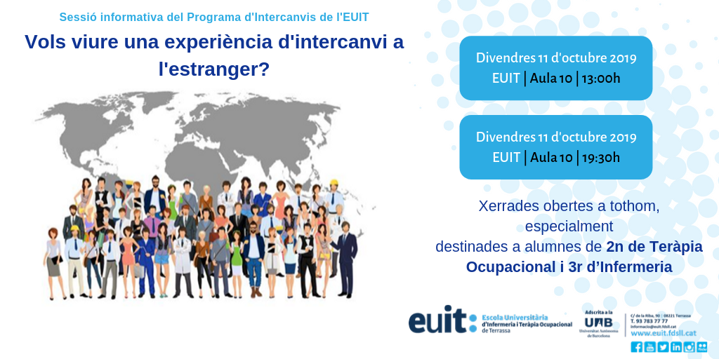 El divendres 11 d’octubre a l’EUIT es realitzaran dues sessions informatives (matí i tarda) sobre els programes d’intercanvi universitaris. L’objectiu d’aquestes sessions és donar a conèixer el funcionament dels programes ErasmusPlus, UAB Exchange Programme i SICUE, així com les destinacions que inclouen. Les xerrades són obertes a tothom, especialment destinades a estudiants de 2n del Grau en Teràpia Ocupacional i 3r del Grau en Infermeria.