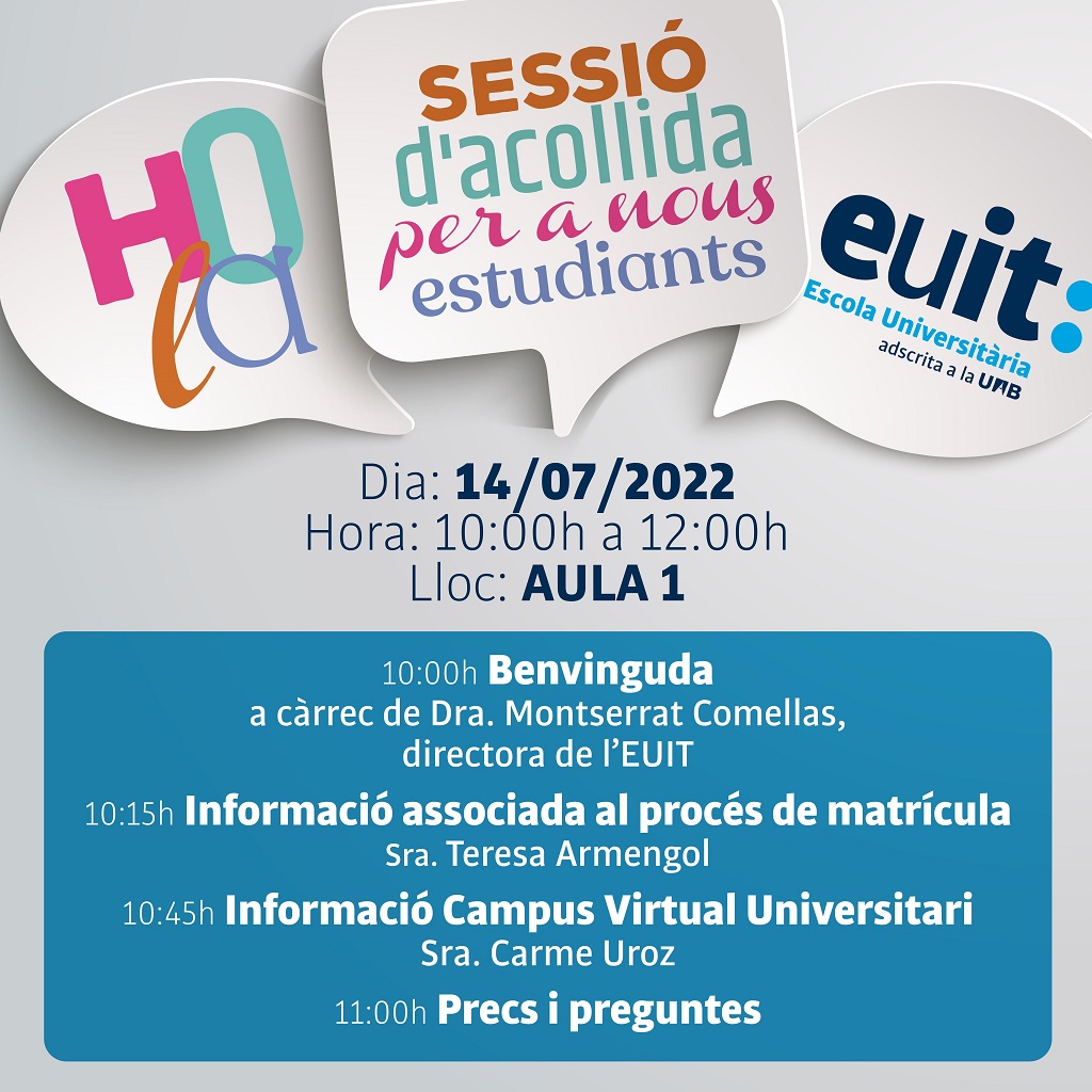 El proper dijous 14 de juliol durem a terme la sessió d’acollida per a nous estudiants de l’EUIT en la que s’informarà del procés de matriculació i de tot el que té a veure amb l’accés al Campus Virtual Universitari.