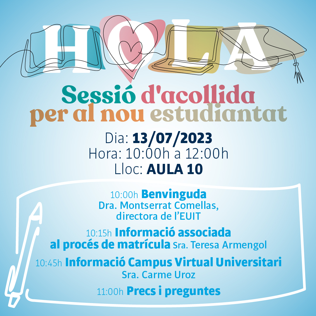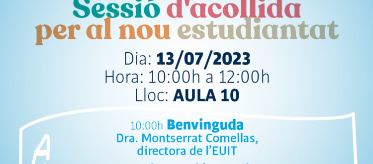 El proper dijous 13 de juliol durem a terme la sessió d’acollida dirigida al nou estudiantat de l’EUIT en la que s’informarà del procés de matriculació i de tot el que té a veure amb l’accés al Campus Virtual Universitari.
