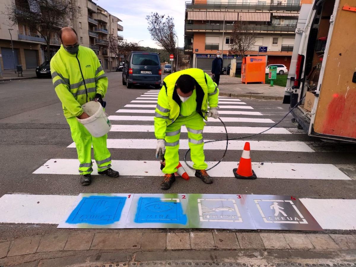 COL·LOCACIÓ DE PICTOGRAMES EN UN PAS DE VIANANTS DE TERRASSA Foto: Diari de Terrassa