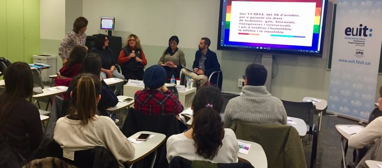 Con la participación de los invitados Álex Bixquert, miembro de la asociación LGTB+ de Terrassa, Ton Mansilla, responsable de la oficina de denuncias Observatorio contra la Homofobia de Barcelona, y Mónica Raspall, enfermera de la Unidad ATRA-UTE de CatSalut, y la colaboración de nuestras profesoras, Eva Fernández y Guadalupe Sánchez, tuvimos la oportunidad de participar de manera muy activa en una sesión de temática muy actual, tratando diversas experiencias en primera persona, en el entorno social y profesional.
