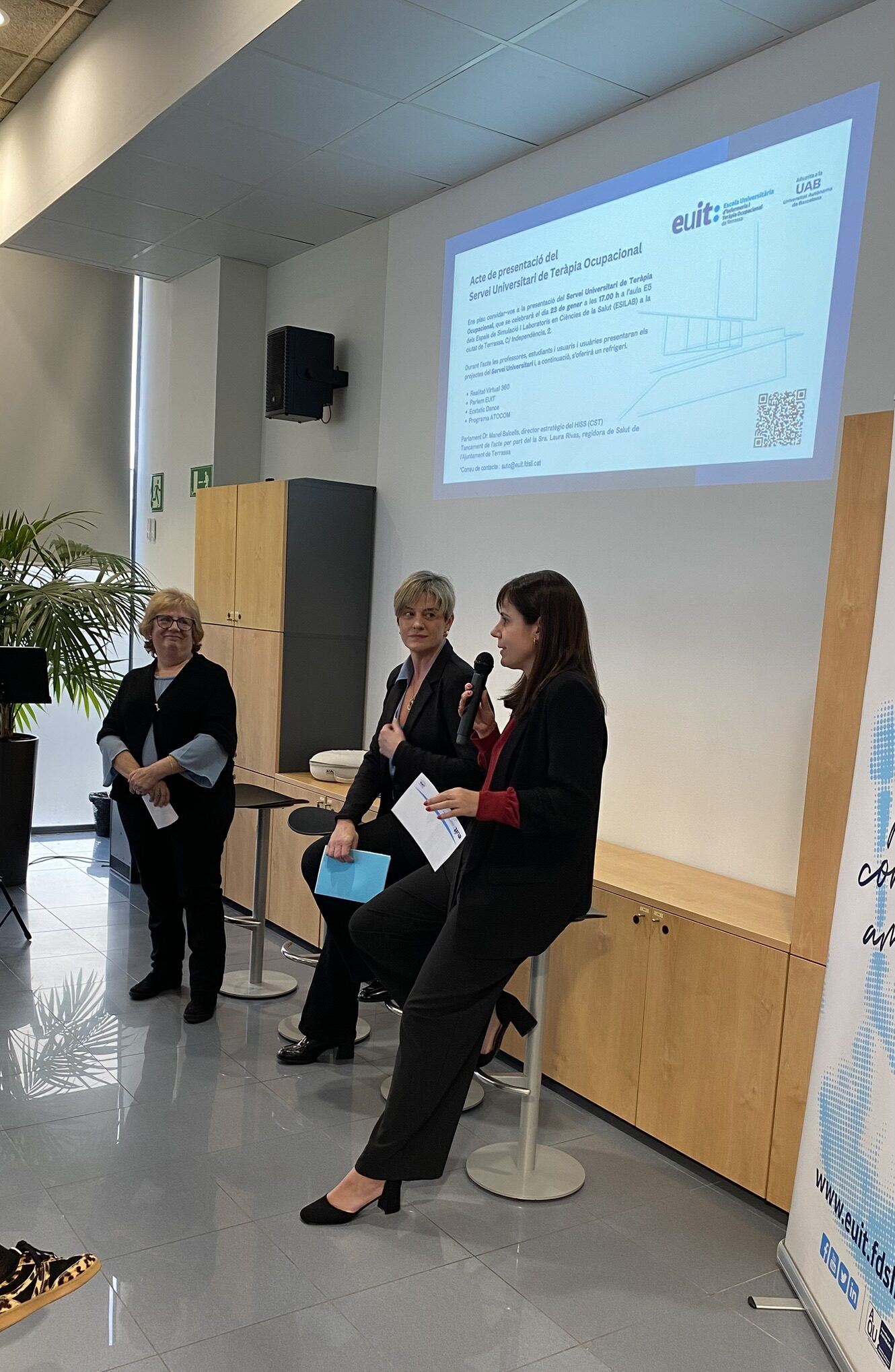 El acto estuvo presidido por la Dra. Montserrat Comellas, directora de la EUIT; la Dra. Loreto González, coordinadora del grado en Terapia Ocupacional, y la Dra. Laura Vidaña, responsable del Servicio Universitario de Terapia Ocupacional (SUTO), y contó con la presencia de la Sra. Laura Rivas, concejala de Salud del Ayuntamiento de Terrassa; el Sr. Manel Balcells, director estratégico del Hub de Innovación Social y Sanitaria (HiSS), además de directivos y responsables de los centros de salud de la ciudad, universidades, colegios oficiales, así como otras entidades y profesionales vinculados al mundo de la Investigación y la Terapia Ocupacional.