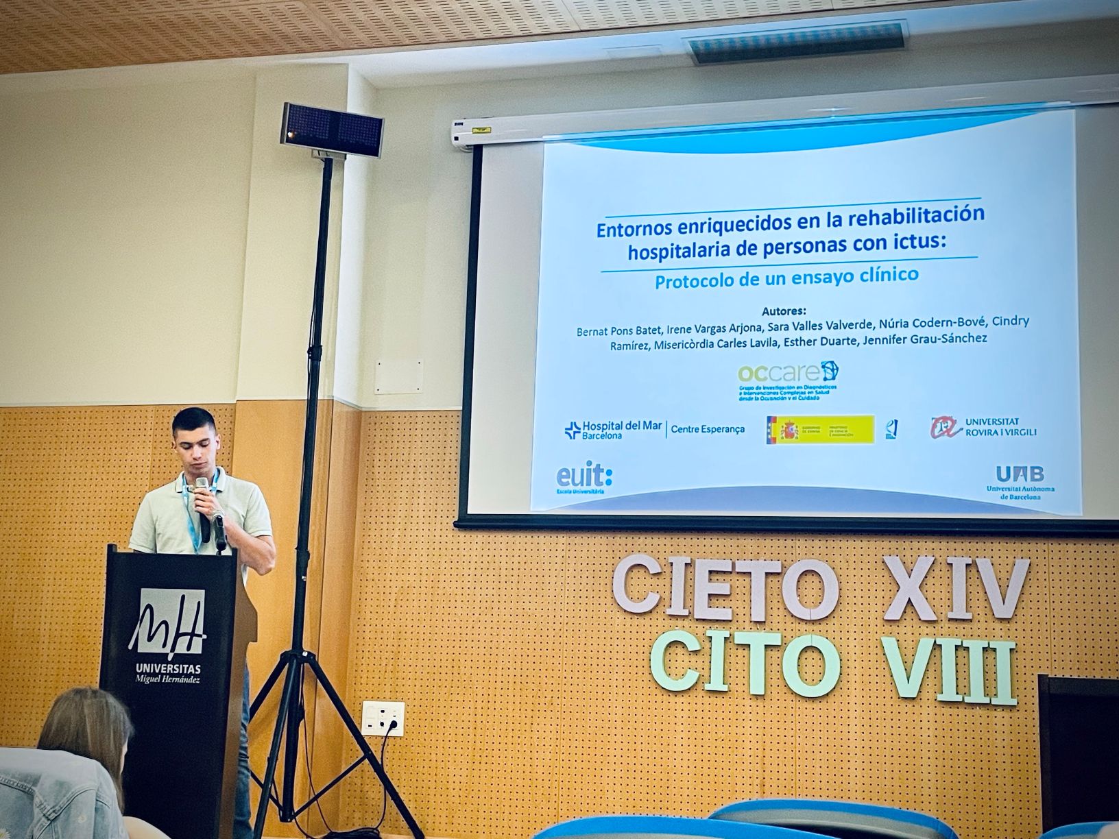 Bernat Pons, alumno de 3º del grado en Terapia Ocupacional de la EUIT, e Irene Vargas, alumna de 2º, han hecho una presentación oral en el XIV Congreso Internacional de Estudiantes de Terapia Ocupacional (CIETO) que se celebra desde hoy hasta el viernes en la Universidad Miguel Hernández de Alicante.